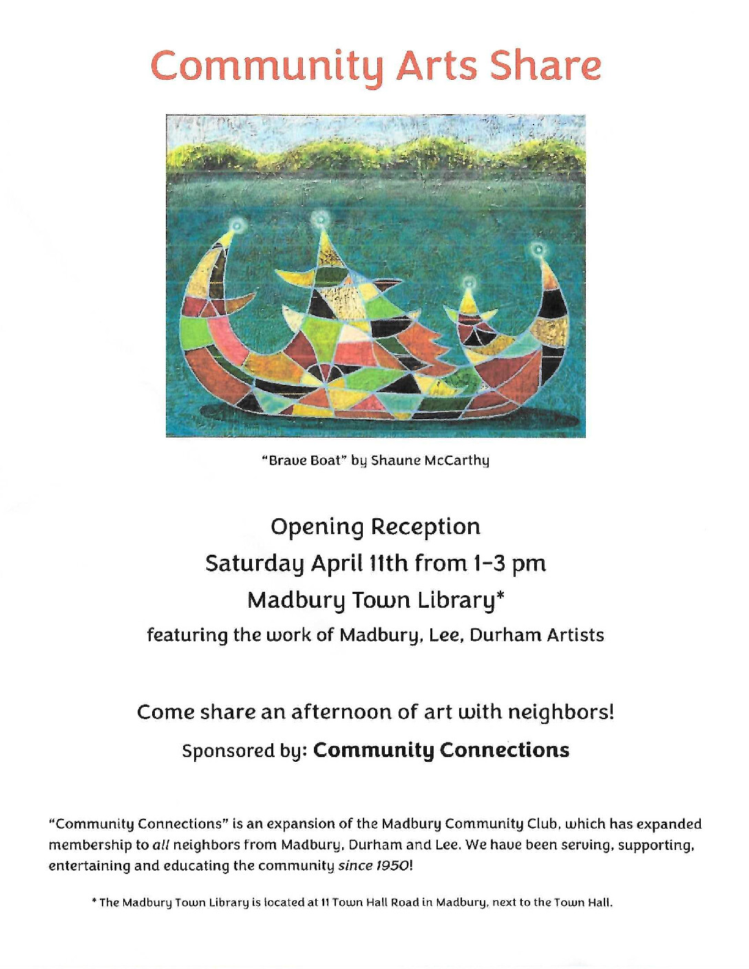 Come share an afternoon of art with neighbors! Community Connections has curated an exhibition of work by artists from Madbury, Durham, and Lee and are hosting an exhibition opening and reception that all are welcome to attend. The art will remain on display through April 28.